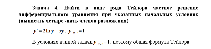 Задача 4. Найти в виде ряда Тейлора частное решение дифференциального уравнения при указанных начальных условиях (выписать четыре -пять членов разложения)
