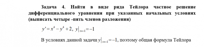 Задача 4. Найти в виде ряда Тейлора частное решение дифференциального уравнения при указанных начальных условиях (выписать четыре -пять членов разложения)