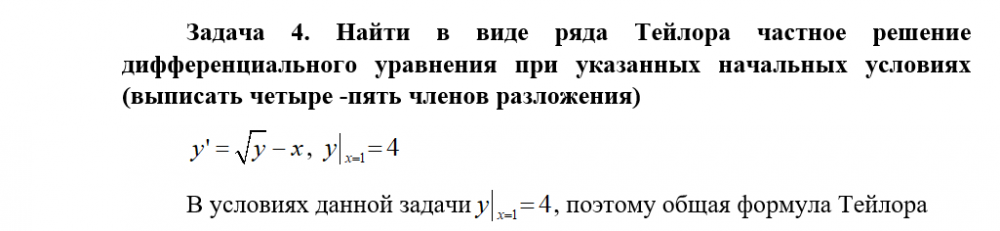 Задача 4. Найти в виде ряда Тейлора частное решение дифференциального уравнения при указанных начальных условиях (выписать четыре -пять членов разложения)