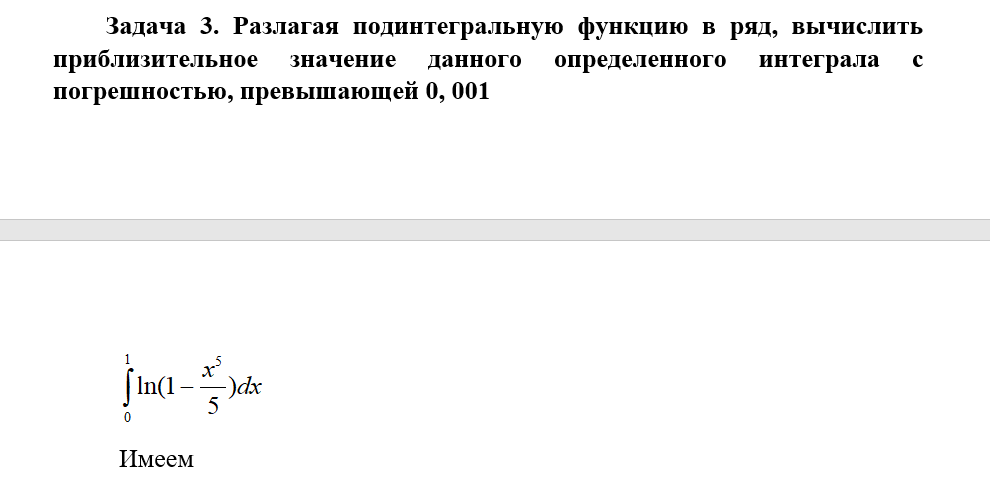 Задача 3. Разлагая подинтегральную функцию в ряд, вычислить приблизительное значение данного определенного интеграла с погрешностью, превышающей 0, 001