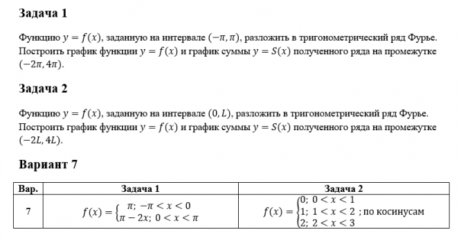 Задача 1 Функцию y=f(x), заданную на интервале (-π,π), разложить в тригонометрический ряд Фурье. Построить график функции y=f(x) и график суммы y=S(x) полученного ряда на промежутке (-2π,4π). Задача 2 Функцию y=f(x), заданную на интервале (0,L), разложить в тригонометрический ряд Фурье. Построить график функции y=f(x) и график суммы y=S(x) полученного ряда на промежутке (-2L,4L). Вариант 7 Вар.Задача 1Задача 2 7f(x)={█(π; -π<x<0@π-2x; 0<x<π)┤f(x)={█(0; 0<x<1@1; 1<x<2@2; 2<x<3)┤ ;по косинусам .