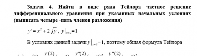 Задача 4. Найти в виде ряда Тейлора частное решение дифференциального уравнения при указанных начальных условиях (выписать четыре -пять членов разложения)