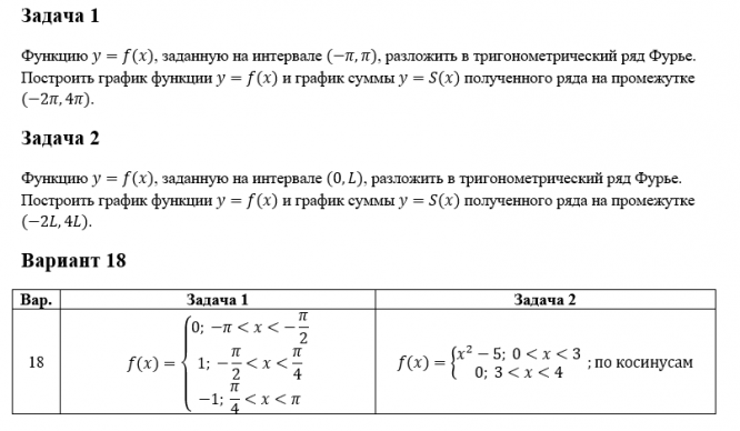 Задача 1 Функцию y=f(x), заданную на интервале (-π,π), разложить в тригонометрический ряд Фурье. Построить график функции y=f(x) и график суммы y=S(x) полученного ряда на промежутке (-2π,4π). Задача 2 Функцию y=f(x), заданную на интервале (0,L), разложить в тригонометрический ряд Фурье. Построить график функции y=f(x) и график суммы y=S(x) полученного ряда на промежутке (-2L,4L). Вариант 18 Вар.Задача 1Задача 2 18f(x)={█(0; -π<x<-π/2@1; -π/2<x<π/4@-1; π/4<x<π)┤f(x)={█(x^2-5; 0<x<3@0; 3<x<4)┤ ;по косинусам .