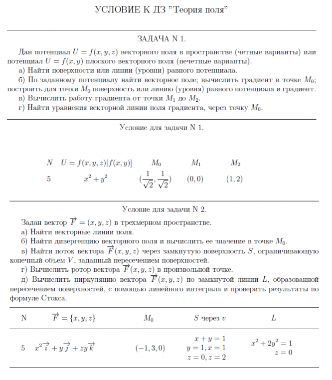 УСЛОВИЕ К ДЗ \"Теория поля\" ЗАДАЧА N 1. Дан потенциал U = f(x, y, z) векторного поля в пространстве (четные варианты) или потенциал U = f(x, y) плоского векторного поля (нечетные варианты). а) Найти поверхности или линии (уровни) равного потенциала. б) По заданному потенциалу найти векторное поле; вычислить градиент в точке M0; построить для точки M0 поверхность или линию (уровня) равного потенциала и градиент. в) Вычислить работу градиента от точки M1 до M2. г) Найти уравнения векторной линии поля градиента, через точку M0. Условие для задачи N 1. Условие для задачи N 2. Задан вектор !F = (x, y, z) в трехмерном пространстве. а) Найти векторные линии поля.