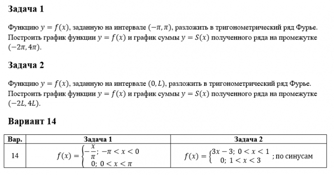 Задача 1 Функцию y=f(x), заданную на интервале (-π,π), разложить в тригонометрический ряд Фурье. Построить график функции y=f(x) и график суммы y=S(x) полученного ряда на промежутке (-2π,4π). Задача 2 Функцию y=f(x), заданную на интервале (0,L), разложить в тригонометрический ряд Фурье. Построить график функции y=f(x) и график суммы y=S(x) полученного ряда на промежутке (-2L,4L). Вариант 14 Вар.Задача 1Задача 2 14f(x)={█(-x/π; -π<x<0@0; 0<x<π)┤f(x)={█(3x-3; 0<x<1@0; 1<x<3)┤ ;по синусам .