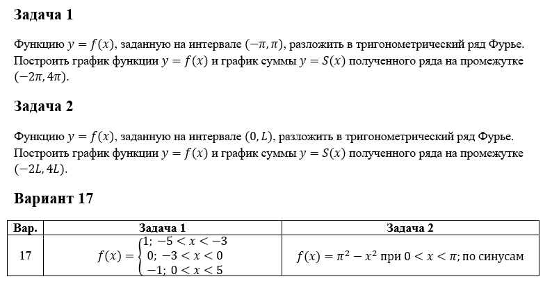 Задача 1 Функцию y=f(x), заданную на интервале (-π,π), разложить в тригонометрический ряд Фурье. Построить график функции y=f(x) и график суммы y=S(x) полученного ряда на промежутке (-2π,4π). Задача 2 Функцию y=f(x), заданную на интервале (0,L), разложить в тригонометрический ряд Фурье. Построить график функции y=f(x) и график суммы y=S(x) полученного ряда на промежутке (-2L,4L). Вариант 17 Вар.Задача 1Задача 2 17f(x)={█(1; -5<x<-3@0; -3<x<0@-1; 0<x<5)┤f(x)=π^2-x^2 при 0<x<π;по синусам .