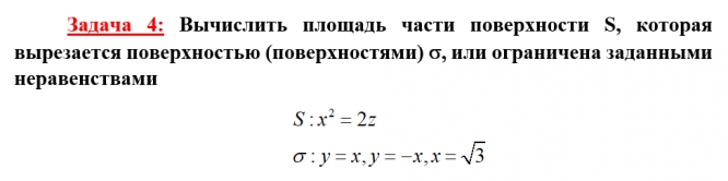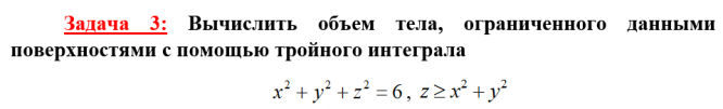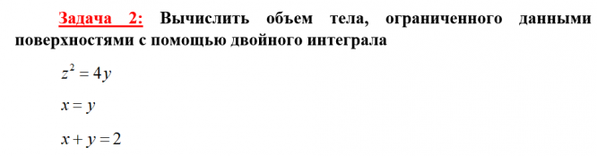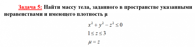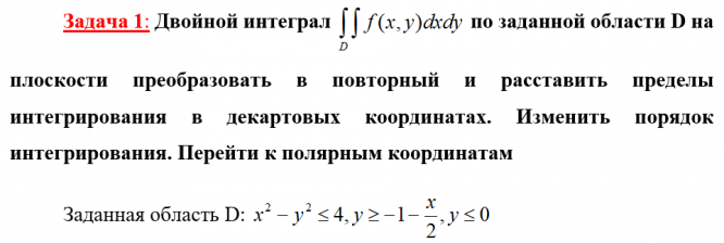 Двойной интеграл по заданной области D на плоскости преобразовать в повторный и расставить пределы интегрирования в декартовых координатах. Изменить порядок интегрирования. Перейти к полярным координатам. Вычислить объем тела, ограниченного данными поверхностями с помощью двойного интеграла. Вычислить объем тела, ограниченного данными поверхностями с помощью тройного интеграла. Вычислить площадь части поверхности S, которая вырезается поверхностью (поверхностями) , или ограничена заданными неравенствами. Найти массу тела, заданного в пространстве указанными неравенствами и имеющего плотность μ.