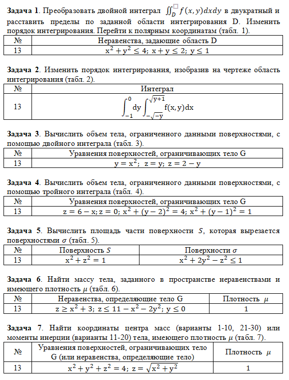 Задача 1 . Преобразовать двойной интеграл в двукратный и расставить пределы по заданной области интегрирования D . Изменить порядок интегрирования. Перейти к полярным координатам (табл. 1). Задача 2 . Изменить порядок интегрирования, изобразив на чертеже область интегрирования (табл. 2). Задача 3 . Вычислить объем тела, ограниченного данными поверхностями, с помощью двойного интеграла (табл. 3). Задача 4 . Вычислить объем тела, ограниченного данными поверхностями, с помощью тройного интеграла (табл. 4). Задача 5 . Вычислить площадь части поверхности , которая вырезается поверхностями (табл. 5). Задача 6 . Найти массу тела, заданного в пространстве неравенствами и имеющего плотность (табл.