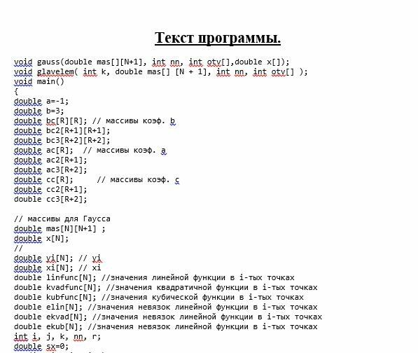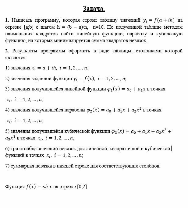 1. Написать программу, которая строит таблицу значений на отрезке [a;b] с шагом h = (ba)/n, n=10. По полученной таблице методом наименьших квадратов найти линейную функцию, параболу и кубическую функцию, на которых минимизируется сумма квадратов невязок.