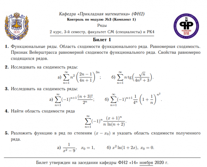 Для студентов МГТУ им. Н.Э.Баумана по предмету Кратные интегралы и ряды30 билетов к РК по рядам (условие), специалисты, СМ30 билетов к РК по рядам (условие), специалисты, СМ