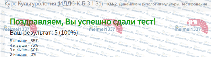 Для студентов ИДДО НИУ «МЭИ» по предмету КультурологияКурс Культурология - КМ-2. Динамика и типология культуры. ТестированиеКурс Культурология - КМ-2. Динамика и типология культуры. Тестирование