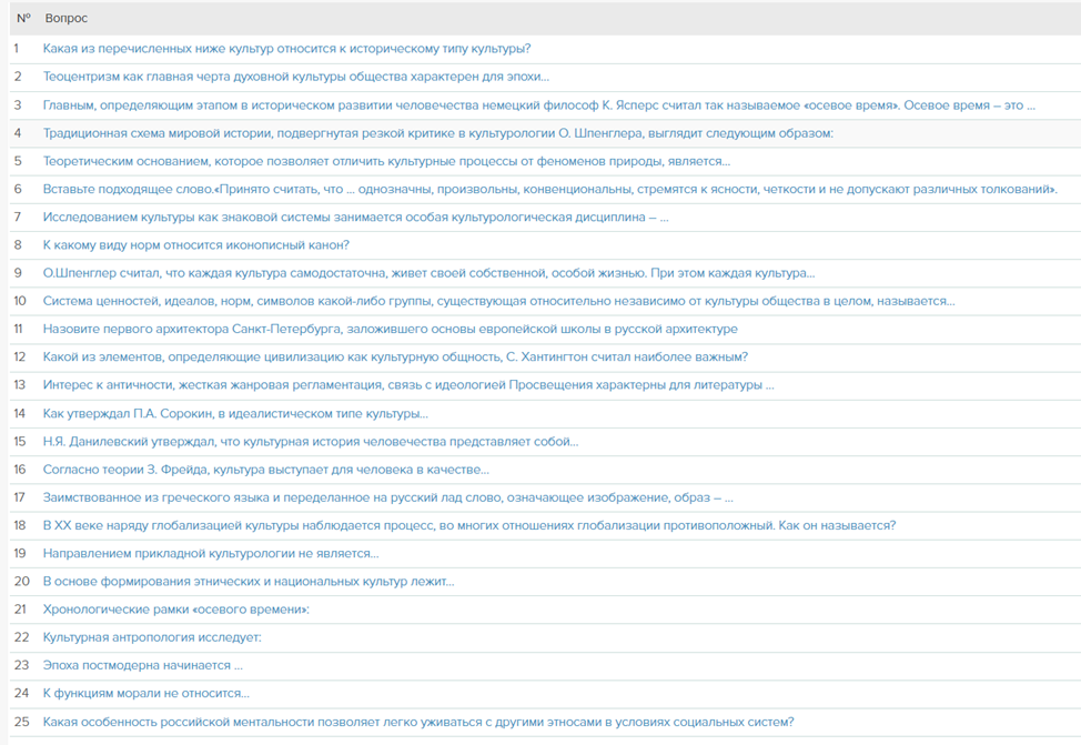 Вот список вопросов из файла: - Какая из перечисленных ниже культур относится к историческому типу культуры?