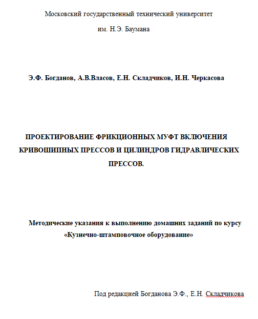 Для студентов МГТУ им. Н.Э.Баумана по предмету Кузнечно-штамповочное оборудование (КШО) (МТ-6)Э.Ф. Богданов, А.В.Власов, Е.Н. Складчиков, И.Н. Черкасова - Проектирование фрикционных муфт включения кривошипных прессов и цилиндров гидравлических Э.Ф. Богданов, А.В.Власов, Е.Н. Складчиков, И.Н. Черкасова - Проектирование фрикционных муфт включения кривошипных прессов и цилиндров гидравлических 2021-01-14СтудИзба