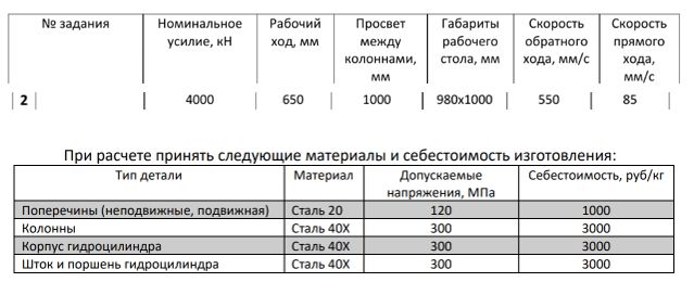 Рассчитать примерную себестоимость основной конструкции гидравлического пресса с заданными характеристиками. При расчете считать, что пресс имеет четырехколонную станину, один рабочий цилиндр с опорой на фланец и насосный тип привода с нерегулируемым насосом. Зачтено на максимум.