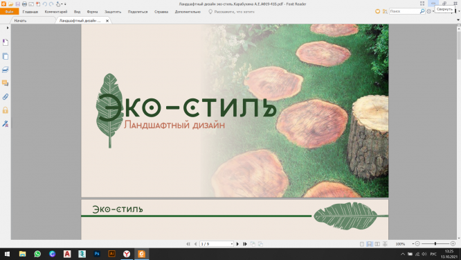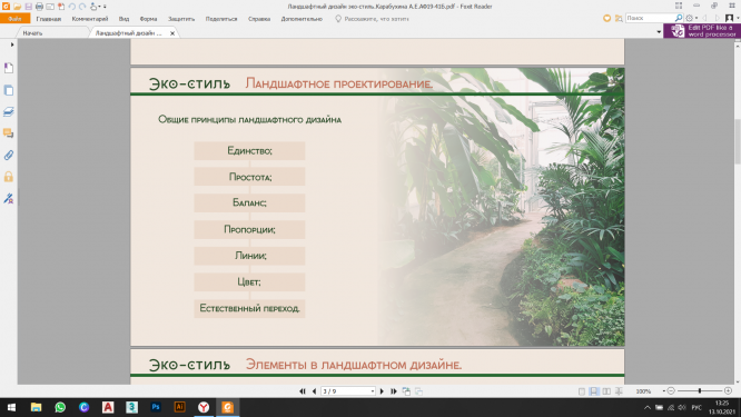 9 слайдов эстетичной презентации в формате PDF с описание интересных особенностей эко-стиля. В работе содержатся красивые фотографии, интересные элементы оформления, принципы ландшафтного дизайна, элементы, стили ландшафтного дизайна, отличительные черты и вывод.