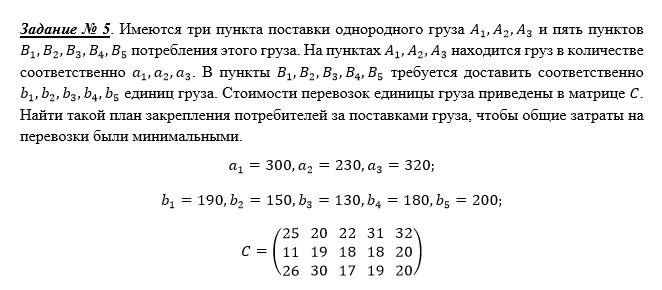 Имеются три пункта поставки однородного груза и пять пунктов потребления этого груза. На пунктах находится груз в количестве соответственно . В пункты требуется доставить соответственно единиц груза. Стоимости перевозок единицы груза приведены в матрице . Найти такой план закрепления потребителей за поставками груза, чтобы общие затраты на перевозки были минимальными.