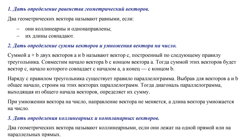 6. Дать определение базиса и координат вектора. 7. Сформулировать теорему о разложении вектора по базису.