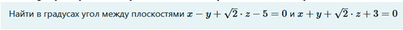 Найти в градусах угол между плоскостями x−y+2–√⋅z−5=0 и x+y+2–√⋅z+3=0