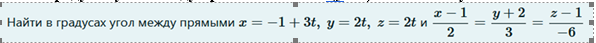 Найти в градусах угол между прямыми x=−1+3t,y=2t,z=2t и x−12=y+23=z−1−6