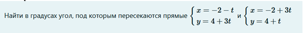 Найти в градусах угол, под которым пересекаются прямые {x=−2−ty=4+3t и {x=−2+3ty=4+t