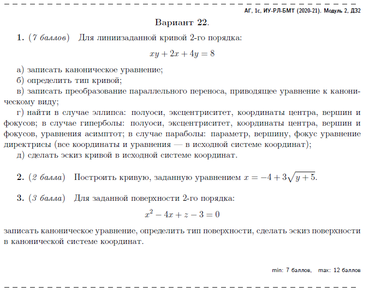1. (7 баллов) Для линии заданной кривой 2-го порядка: а) записать каноническое уравнение; б) определить тип кривой; в) записать преобразование параллельного переноса, приводящее уравнение к каноническому виду; г) найти в случае эллипса: полуоси, эксцентриситет, координаты центра, вершин и фокусов; в случае гиперболы: полуоси, эксцентриситет, координаты центра, вершин и фокусов, уравнения асимптот; в случае параболы: параметр, вершину, фокус, уравнение директрисы (все координаты и уравнения — в исходной системе координат); д) сделать эскиз кривой в исходной системе координат. 2. (2 балла) Построить кривую, заданную уравнением 3. (3 балла) Для заданной поверхности 2-го порядка: записать каноническое уравнение, определить тип поверхности, сделать эскиз поверхности в канонической системе координат. .