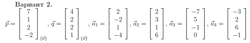 Даны векторы p и q евклидова пространства Е4 с координатами в базисе a1, a2, a3, a4, векторы которого определены относительно некоторого ортонормированного базиса этого пространства.