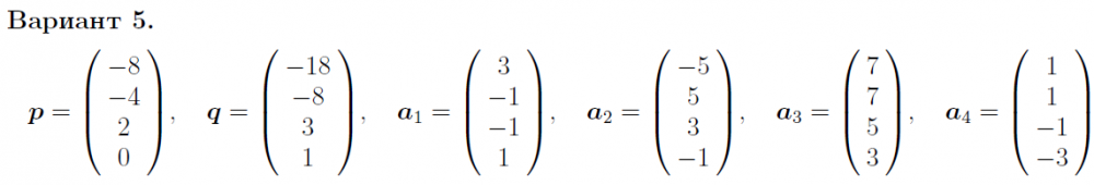 • Задача 2. Векторы p и q евклидова пространства Е4 представлены своими координатами в базисе a1, a2, a3, a4, векторы которого в свою очередь представлены своими координатами в некотором ортонормированном базисе.