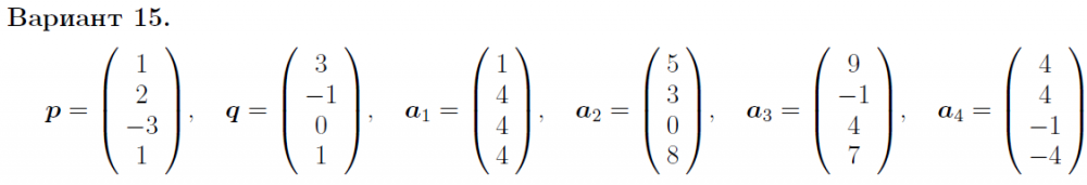 • Задача 2. Векторы p и q евклидова пространства Е4 представлены своими координатами в базисе a1, a2, a3, a4, векторы которого в свою очередь представлены своими координатами в некотором ортонормированном базисе.
