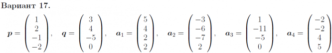 • Задача 2. Векторы p и q евклидова пространства Е4 представлены своими координатами в базисе a1, a2, a3, a4, векторы которого в свою очередь представлены своими координатами в некотором ортонормированном базисе.