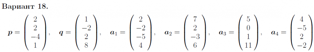 • Задача 2. Векторы p и q евклидова пространства Е4 представлены своими координатами в базисе a1, a2, a3, a4, векторы которого в свою очередь представлены своими координатами в некотором ортонормированном базисе.