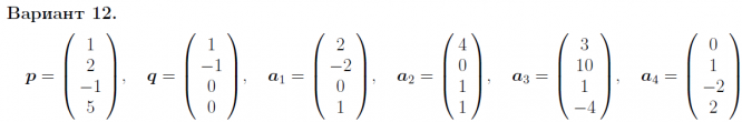 • Задача 2. Векторы p и q евклидова пространства Е4 представлены своими координатами в базисе a1, a2, a3, a4, векторы которого в свою очередь представлены своими координатами в некотором ортонормированном базисе.