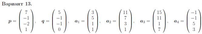 - Задача 2. Векторы p и q евклидова пространства Е4 представлены своими координатами в базисе a1, a2, a3, a4, векторы которого в свою очередь представлены своими координатами в некотором ортонормированном базисе.