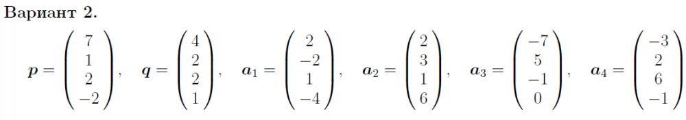 • Задача 2. Векторы p и q евклидова пространства Е4 представлены своими координатами в базисе a1, a2, a3, a4, векторы которого в свою очередь представлены своими координатами в некотором ортонормированном базисе.