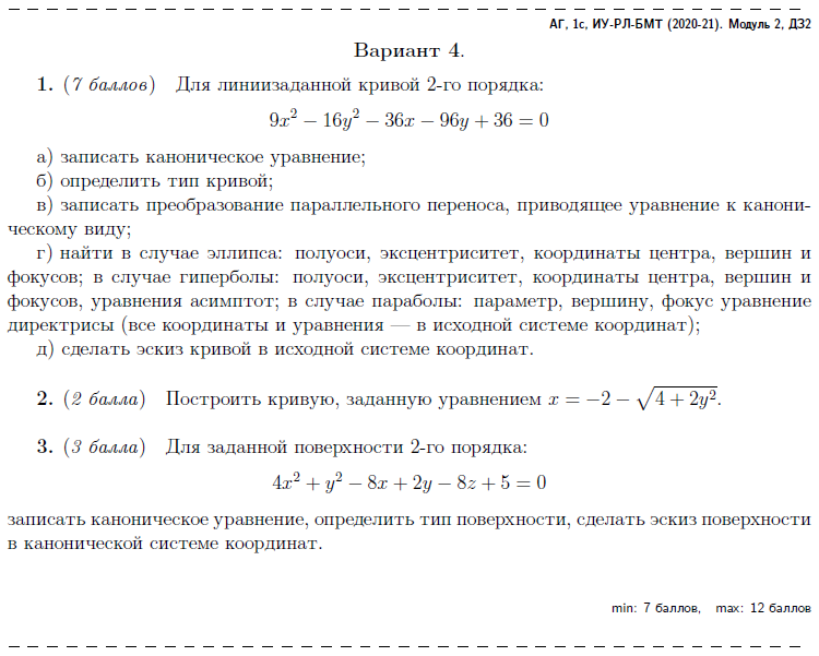 1. (7 баллов) Для линии заданной кривой 2-го порядка: а) записать каноническое уравнение; б) определить тип кривой; в) записать преобразование параллельного переноса, приводящее уравнение к каноническому виду; г) найти в случае эллипса: полуоси, эксцентриситет, координаты центра, вершин и фокусов; в случае гиперболы: полуоси, эксцентриситет, координаты центра, вершин и фокусов, уравнения асимптот; в случае параболы: параметр, вершину, фокус, уравнение директрисы (все координаты и уравнения — в исходной системе координат); д) сделать эскиз кривой в исходной системе координат. 2. (2 балла) Построить кривую, заданную уравнением 3. (3 балла) Для заданной поверхности 2-го порядка: записать каноническое уравнение, определить тип поверхности, сделать эскиз поверхности в канонической системе координат. .