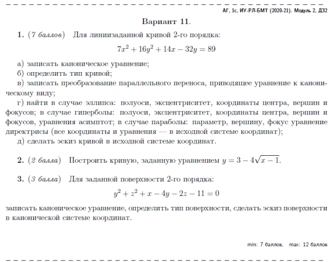 1. (7 баллов) Для линии заданной кривой 2-го порядка: а) записать каноническое уравнение; б) определить тип кривой; в) записать преобразование параллельного переноса, приводящее уравнение к каноническому виду; г) найти в случае эллипса: полуоси, эксцентриситет, координаты центра, вершин и фокусов; в случае гиперболы: полуоси, эксцентриситет, координаты центра, вершин и фокусов, уравнения асимптот; в случае параболы: параметр, вершину, фокус, уравнение директрисы (все координаты и уравнения — в исходной системе координат); д) сделать эскиз кривой в исходной системе координат. 2. (2 балла) Построить кривую, заданную уравнением 3. (3 балла) Для заданной поверхности 2-го порядка: записать каноническое уравнение, определить тип поверхности, сделать эскиз поверхности в канонической системе координат. .