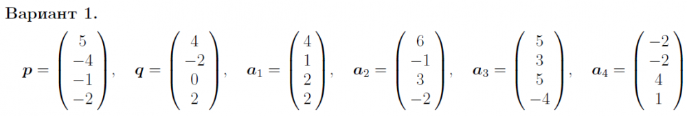 • Задача 2. Векторы p и q евклидова пространства Е4 представлены своими координатами в базисе a1, a2, a3, a4, векторы которого в свою очередь представлены своими координатами в некотором ортонормированном базисе.
