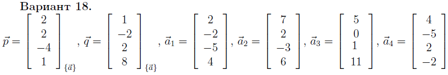 Даны векторы p и q евклидова пространства Е4 с координатами в базисе a1, a2, a3, a4, векторы которого определены относительно некоторого ортонормированного базиса этого пространства.