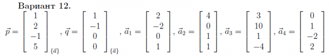 Даны векторы p и q евклидова пространства Е4 с координатами в базисе a1, a2, a3, a4, векторы которого определены относительно некоторого ортонормированного базиса этого пространства.
