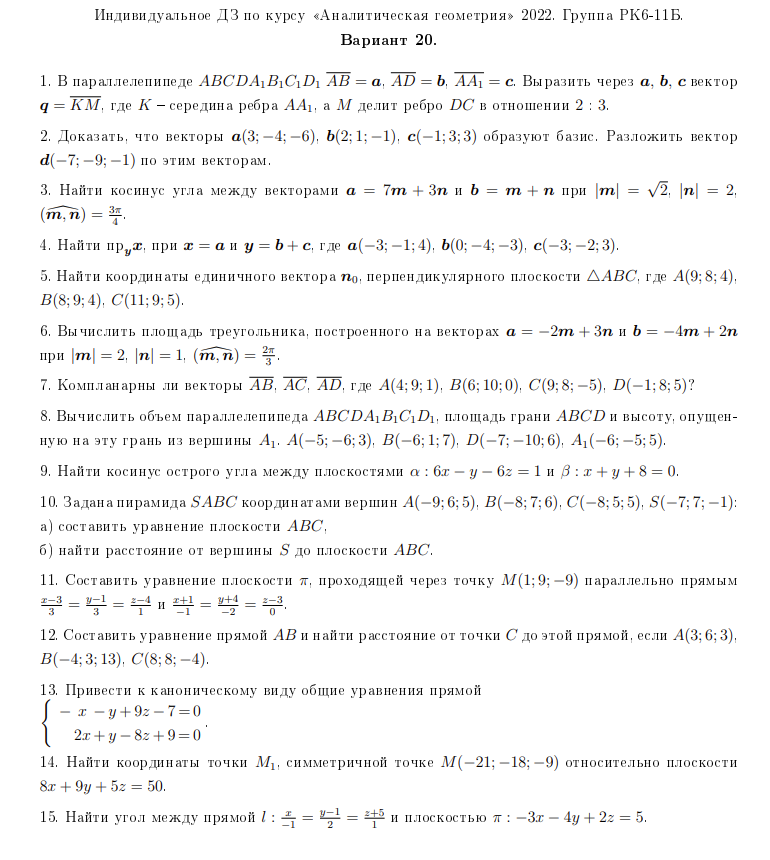 ДЗ 1: Векторная алгебра и аналитическая геометрия вариант 20