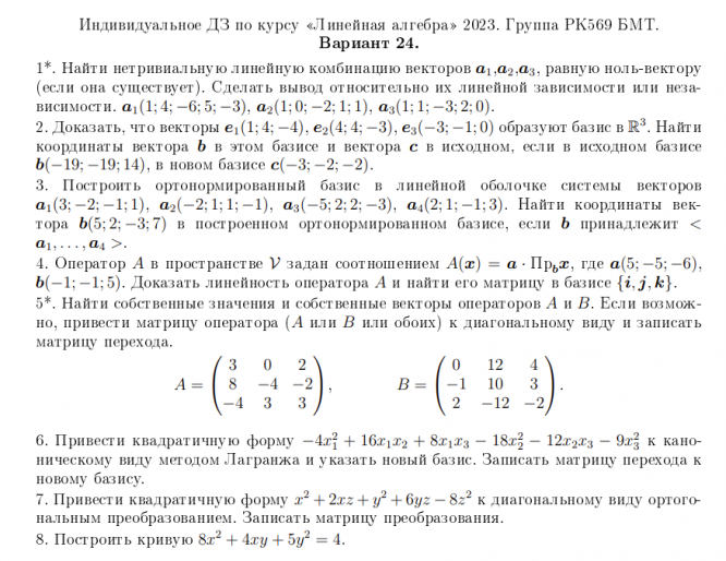 Индивидуальное ДЗ по курсу «Линейная алгебра» 2023. Группа РК569 БМТ. Вариант 24. 1*. Найти нетривиальную линейную комбинацию векторов 𝑎1,𝑎2,𝑎3, равную ноль-вектору (если она существует). Сделать вывод относительно их линейной зависимости или независимости. 𝑎1(1; 4; −6; 5; −3), 𝑎2(1; 0; −2; 1; 1), 𝑎3(1; 1; −3; 2; 0). 2. Доказать, что векторы 𝑒1(1; 4; −4), 𝑒2(4; 4; −3), 𝑒3(−3; −1; 0) образуют базис в R 3 . Найти координаты вектора 𝑏 в этом базисе и вектора 𝑐 в исходном, если в исходном базисе 𝑏(−19; −19; 14), в новом базисе 𝑐(−3; −2; −2). 3. Построить ортонормированный базис в линейной оболочке системы векторов 𝑎1(3; −2; −1; 1), 𝑎2(−2; 1; 1; −1), 𝑎3(−5; 2; 2; −3), 𝑎4(2; 1; −1; 3).