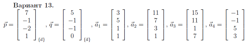 Даны векторы p и q евклидова пространства Е4 с координатами в базисе a1, a2, a3, a4, векторы которого определены относительно некоторого ортонормированного базиса этого пространства.