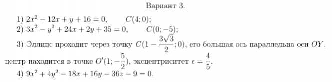В задаче 4 указать преобразование параллельного переноса, приводящее данное уравнение поверхности к каноническому виду, канонический вид уравнения поверхности и тип поверхности. Построить поверхность в канонической системе координат OXY Z. Вариант 3. 1) 2x 2 − 12x + y + 16 = 0, C(4; 0); 2) 3x 2 − y 2 + 24x + 2y + 35 = 0, C(0; −5); 3) Эллипс проходит через точку С (1 − 3 √ 3 2 ; 0), его большая ось параллельна оси OY , центр находится в точке O 0 (1; − 5 2 ), эксцентриситет ² = 4 5 . 4) 9x 2 + 4y 2 − 18x + 16y − 36z − 9 = 0.