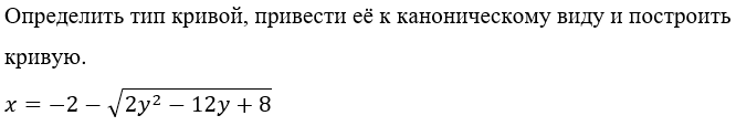 Определить тип кривой, привести к каноническому виду и построить кривую, найти координаты фокусов. Для эллипса и гиперболы найти эксцентриситет, для гиперболы составить уравнение асимптот; для параболы найти значение параметра, составить уравнение директрисы.