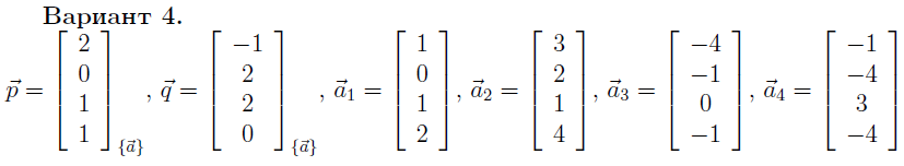 Даны векторы p и q евклидова пространства Е4 с координатами в базисе a1, a2, a3, a4, векторы которого определены относительно некоторого ортонормированного базиса этого пространства.