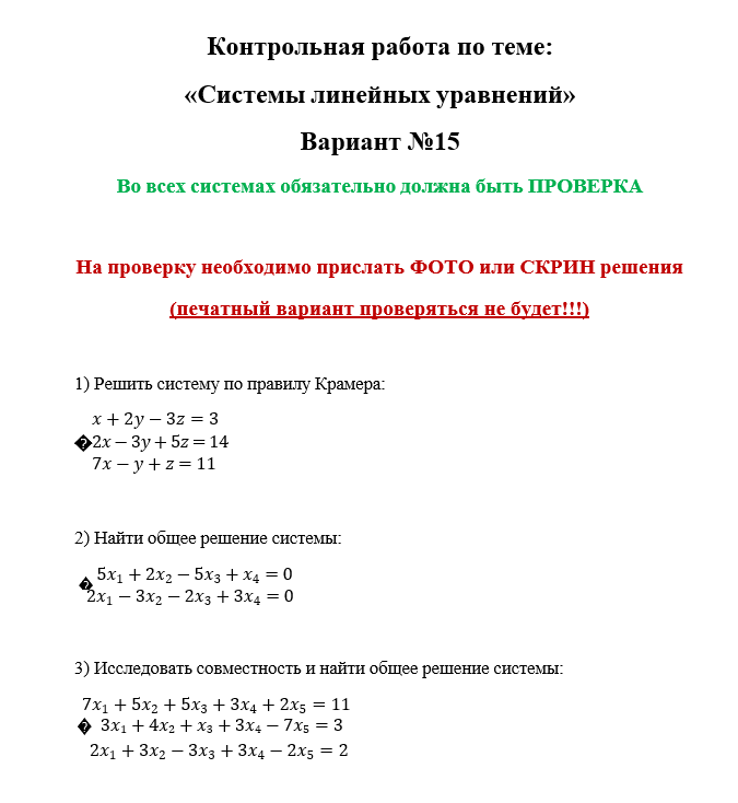Для студентов ИДДО НИУ «МЭИ» по предмету Линейная алгебра и аналитическая геометрияКМ-3. Системы линейных уравнений. Контрольная работа. Вариант 15КМ-3. Системы линейных уравнений. Контрольная работа. Вариант 15