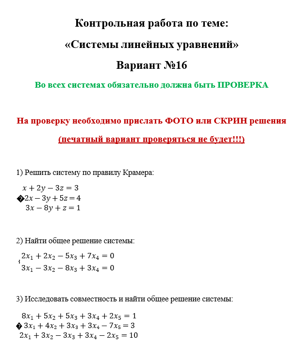 Для студентов ИДДО НИУ «МЭИ» по предмету Линейная алгебра и аналитическая геометрияКМ-3. Системы линейных уравнений. Контрольная работа. Вариант 16КМ-3. Системы линейных уравнений. Контрольная работа. Вариант 16