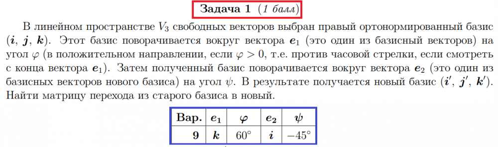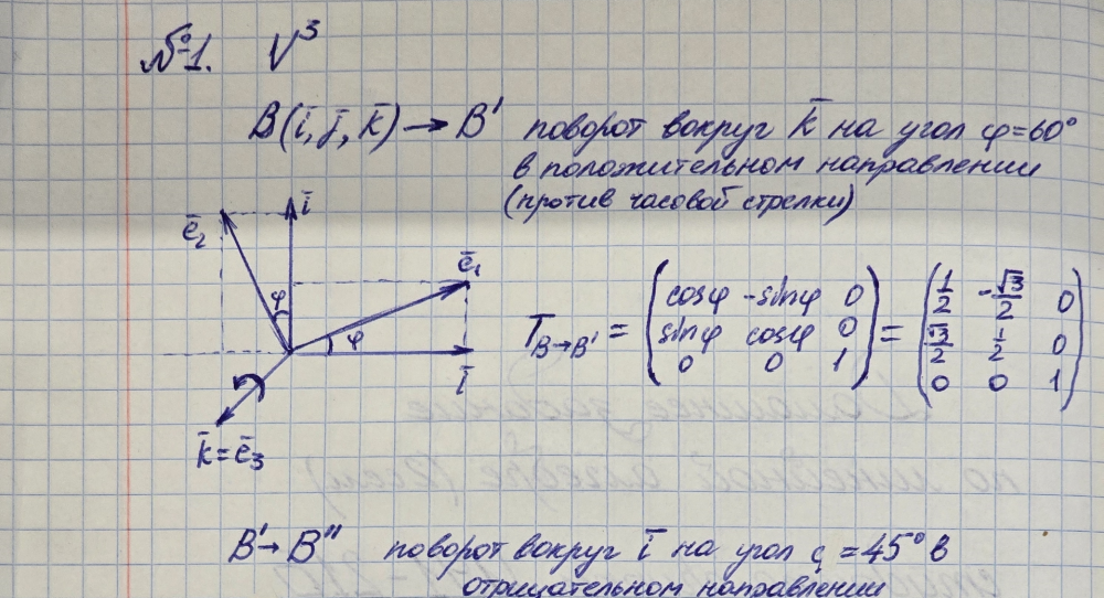 В линейном пространстве V3 свободных векторов выбран правый ортонормированный базис (i, j, k). Этот базис поворачивается вокруг вектора e1 (это один из базисный векторов) на угол ϕ (в положительном направлении, если ϕ > 0, т.е. против часовой стрелки, если смотреть с конца вектора e1). Затем полученный базис поворачивается вокруг вектора e2 (это один из базисных векторов нового базиса) на угол ψ. В результате получается новый базис (i 0 , j 0 , k 0 ). Найти матрицу перехода из старого базиса в новый..