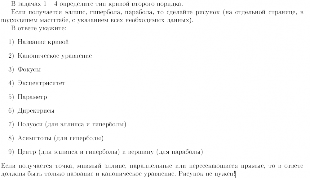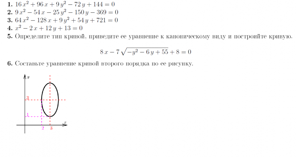 Типовой расчет по теме "Кривые второго порядка" вариант 7 В задачах 1 - 4 определите тип кривой второго порядка. Если получается эллипс, гипербола, парабола, то сделайте рисунок (на отдельной странице, в подходящем масштабе, с указанием всех необходимых данных). В ответе укажите: Название кривой Каноническое уравнение Фокусы Эксцентриситет Параметр Директрисы Полуоси (для эллипса и гиперболы) Асимптоты (для гиперболы) Центр (для эллипса и гиперболы) и вершину (для параболы) Если получается точка, мнимый эллипс, параллельные или пересекающиеся прямые, то в ответе должны быть только название и каноническое уравнение. Рисунок не нужен! 16x2 + 96x + 9y2 - 72y +144 = 0 9x2 - 54x - 25 g - 150 g - 369 = 0 64 x2 - 128 x +9 9y2 + 54 y + 721 = 0 x2 - 2x + 12y + 13 = 0 Определите тип кривой, приведите ее уравнение к каноническому виду и построийте кривую.