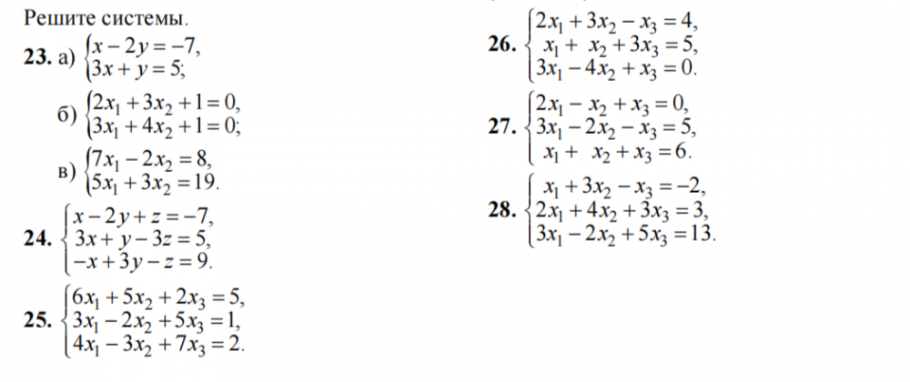 Домашнее задание по "Алгебре и геометрии" по теме 4 "Системы линейных уравнений" Задачи 23-28 в pdf формате для студентов технических направлений ЮУРГУ, 1 семестр