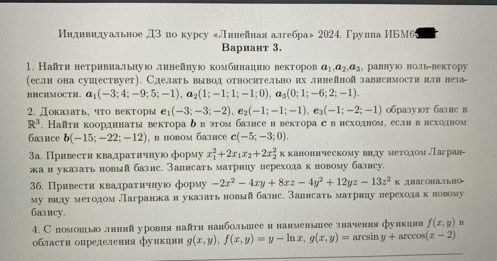 найти нетривиальную линейную комбинацию векторов равную ноль-вектору, доказать что векторы образуют базис, привести квадратичную форму к каноническому виду методом лагранжа и указать новый базис записать матрицу перехода к новому базису, привести квадратичную форму к диагональному виду методом лагранжа и указать новый базис, с помощью линий уровня найти наибольшее и наименьшее значения функции в области определения функции, типовой расчет 1 по линалу мгту им баумана 2 семестр.